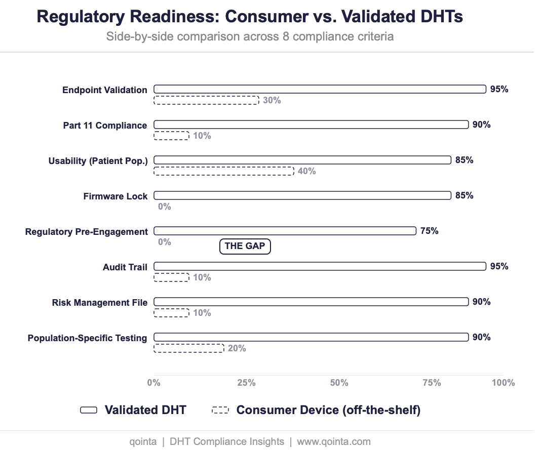 In Duchenne muscular dystrophy trials, wearable-derived stride velocity endpoints were accepted by the EMA as qualified secondary endpoints. The critical difference: these wearables underwent rigorous clinical validation specific to the trial population and endpoint, unlike off-the-shelf consumer alternatives [10].